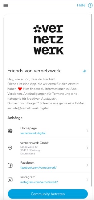 Hier findest du das Handbuch von vernetzwerk. Es dient als Nachschlagewerk in Verbindung mit unserem individuellen Support. Schritt für Schritt erklärt dir diese Seite, wie du deine Community- oder Gemeine-App funktioniert. Im Folgenden werden wir das Wort Community verwenden. Wir verstehen darunter kommunale oder kirchliche Gemeinden und Vereine. Hier findest du eine PDF-Datei für weitere Hilfestellung. Wir aktualisieren das Handbuch regelmäßig, sobald neue Funktionen zur Anwendung hinzugefügt werden. Falls du in dem Handbuch nicht fündig wirst, schreib uns gerne eine E-Mail an info@vernetzwerk.digital.